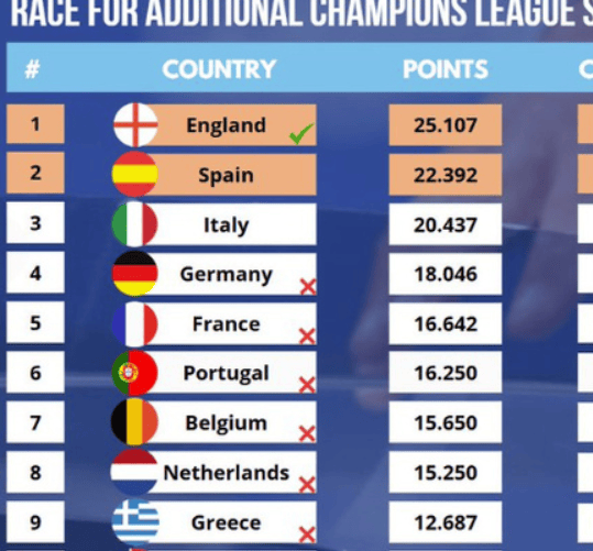欧冠、欧联杯和欧协联的1/4决赛首回合落下帷幕,以当前的欧战积分,英超已锁定下赛季的5个欧冠席位,剩余的一个5欧冠席位联赛将在西甲和意甲之间产生,其余的联赛则皆已出局。根据欧冠资格的规定,当赛季获得欧战积分前两名的球队,将可以在下...